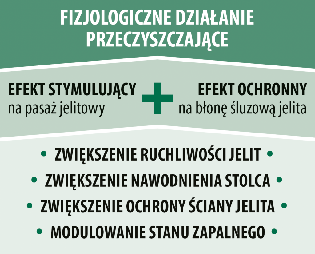Zaleca się przyjmowanie od 1 do 3 tabletek wieczorem, w razie konieczności, popijając dużą ilością wody. Prawidłowa dawka stanowi minimum wystarczające, aby wspomóc pasaż jelitowy bez wytwarzania płynnego stolca, dlatego można ją dostosować do indywidualnych potrzeb. Produkt jest zalecany od 12. roku życia. Co do zasady, aby wspomóc pasaż jelitowy, zaleca się przyjmowanie płynów w ciągu dnia, spożywanie odpowiedniej ilości błonnika oraz aktywność fizyczną.